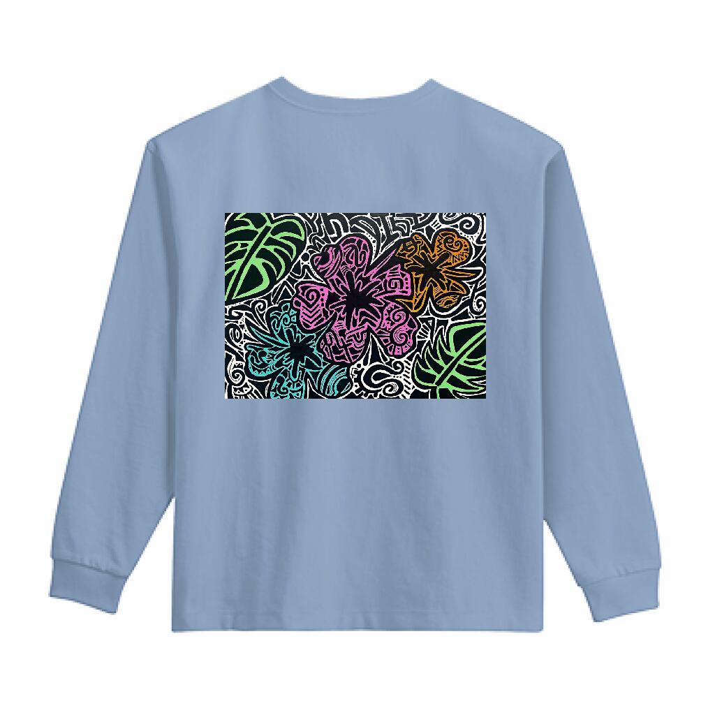 LIFEMAX 10.2oz スーパーヘビーウェイト長袖Tシャツは、その名の通り、頑丈でしっかりとした作りが特徴。手書きで描いたハイビスカスとモンステラのデザインです。 このTシャツは、長く愛用していただけるように、丈夫な生地を使用しています。ヘビーウェイトなのに柔らかく、着心地の良さも抜群。カジュアルなスタイルにもファッションアイテムとしても活躍すること間違いなしです。
